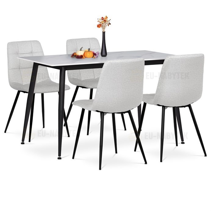 Jídelní set 1+4 kombinuje moderní design s praktickým provedením vhodným pro každodenní použití. Stůl je vybaven deskou z bílého slinutého kamene s mramorovým dekorem, která nabízí pevný a snadno udržovatelný povrch odolný proti poškrábání a teplu. Černá kovová podnož stolu zajišťuje stabilitu a dlouhou životnost. Čtyři židle jsou čalouněné bílou látkou s designovým prošitím na opěradle, které dodává celku elegantní vzhled a zároveň podporuje pohodlí při sezení. Židle mají pevné kovové nohy v černé barvě, které ladí se stolem a zaručují stabilitu. Set je ideální pro menší jídelny či kuchyňské kouty.
