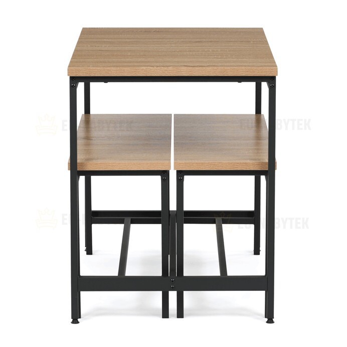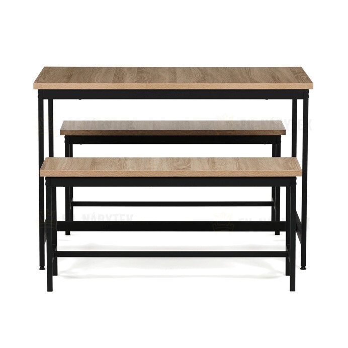 Jídelní set 1+2 s dekorem dubu kombinuje pevnou MDF desku s přírodní barevností a stabilní kovovou podnoží v černém provedení. Stůl o rozměrech 110 × 60 × 75 cm nabízí dostatek prostoru pro pohodlné stolování, zatímco dvě lavice o rozměrech 98 × 30 × 45 cm doplňují sestavu s jednoduchým a funkčním designem. Povrchová úprava MDF desky je navržena pro snadnou údržbu a odolnost vůči běžnému opotřebení, což zajišťuje dlouhodobé užívání. Konstrukce lavic i stolu je stabilní díky kovovým nohám, které přispívají k celkové pevnosti a bezpečnosti. Tento set je vhodný pro čtyři osoby a díky svému minimalistickému stylu se hodí do moderních i klasických interiérů.