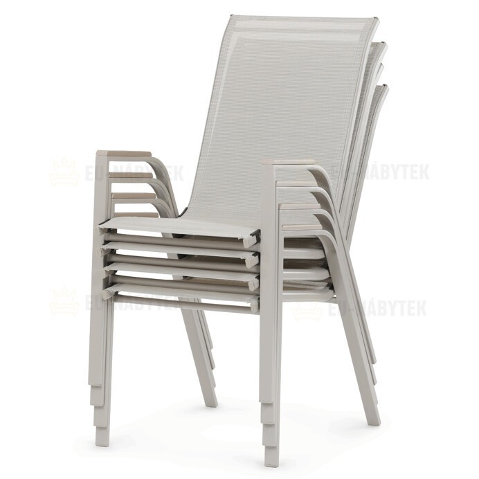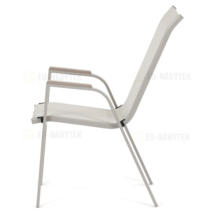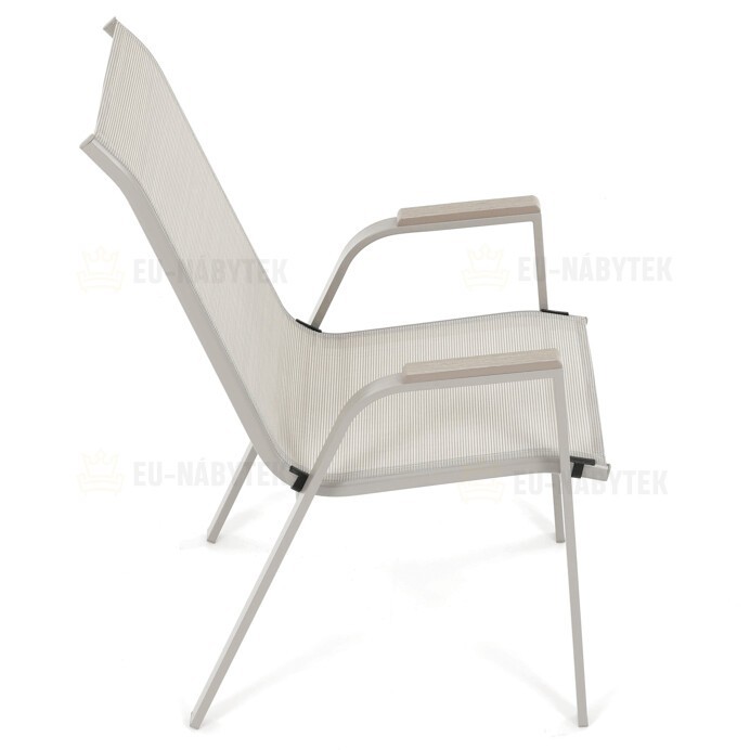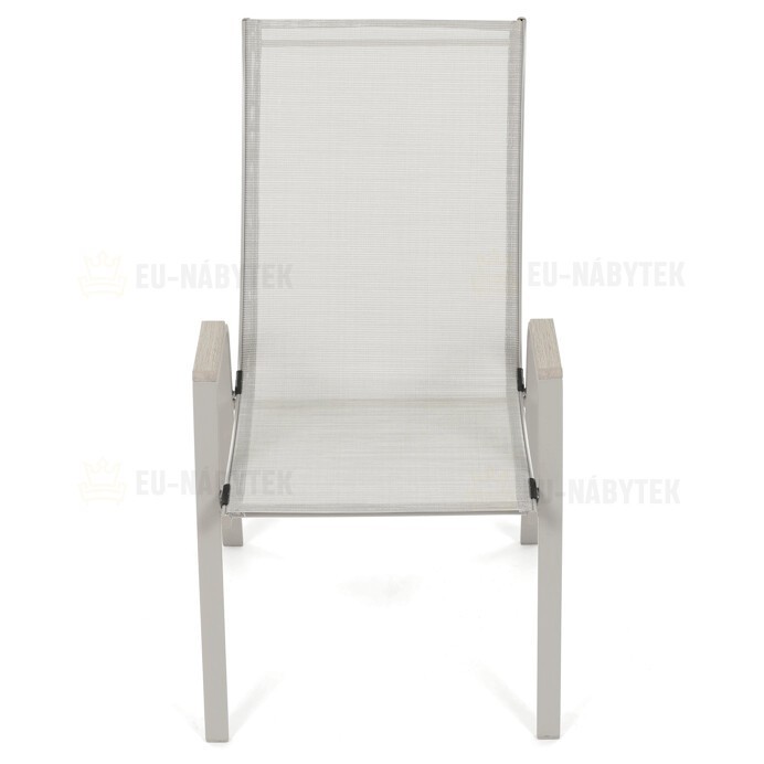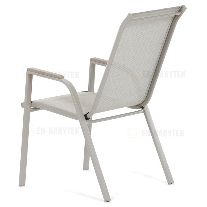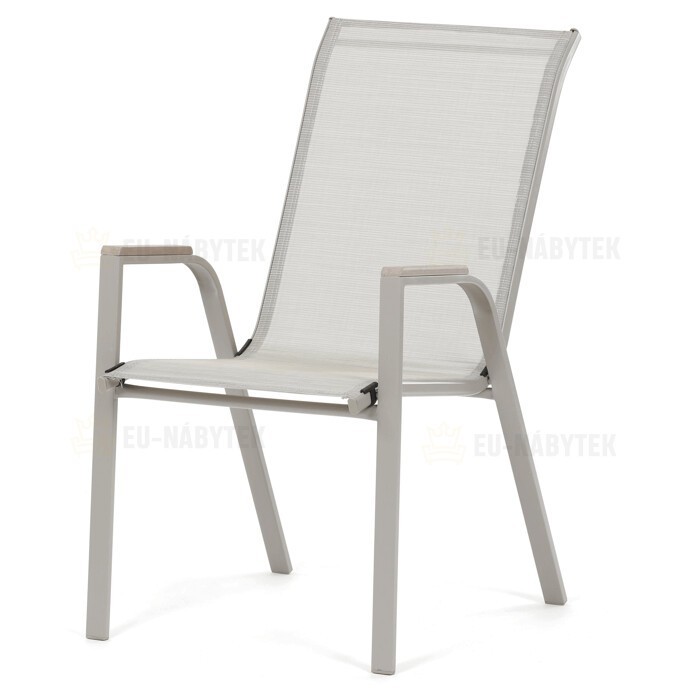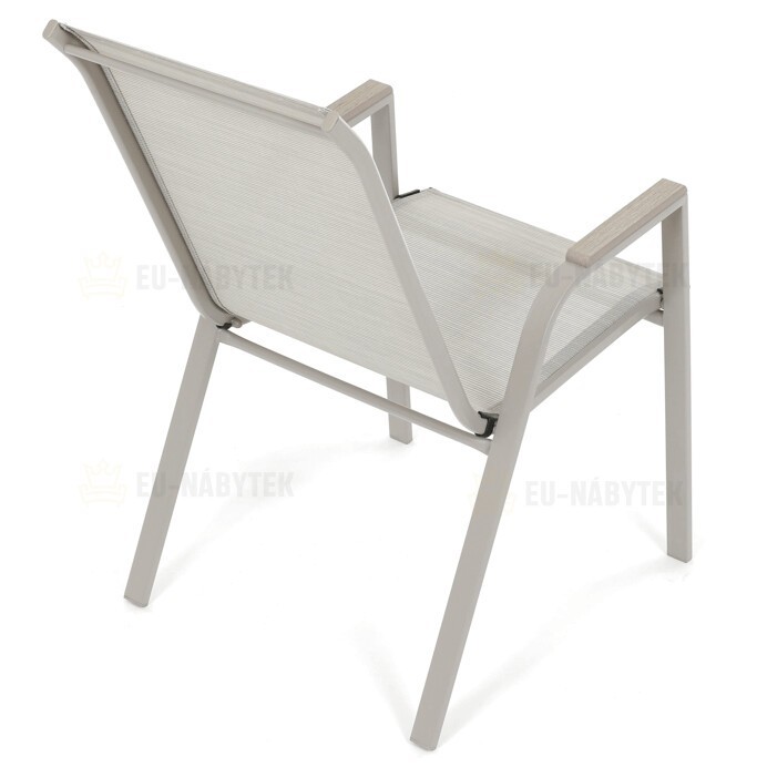 Zahradní židle v béžovém provedení kombinuje pevný rám s polywoodovými područkami v dekoru dubu, které dodávají přírodní vzhled a snadnou údržbu. Sedák a opěradlo jsou potažené odolnou síťovinou, která je příjemná na dotek a umožňuje pohodlné sezení i během teplých dnů díky své prodyšnosti. Konstrukce židle je navržena tak, aby byla stohovatelná, což usnadňuje její skladování a manipulaci. Stabilní kovová podnož zajišťuje bezpečné a pevné opření na různých površích. Díky kombinaci materiálů a designu je židle vhodná pro venkovní použití na terasách, zahradách či balkonech.