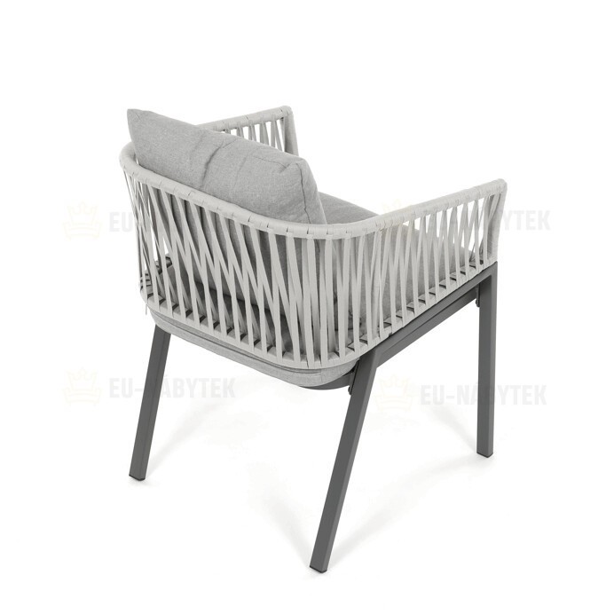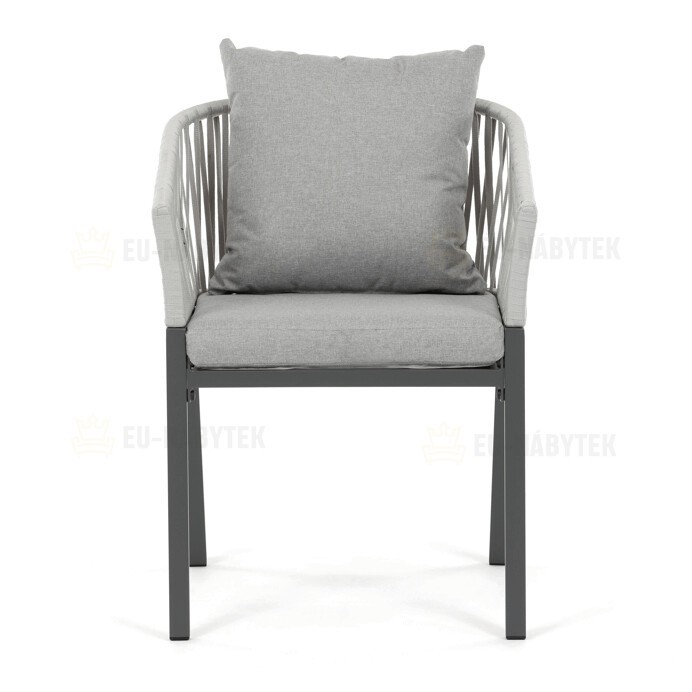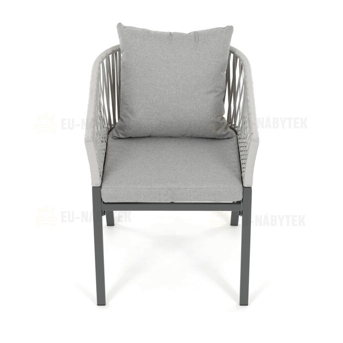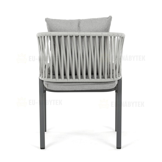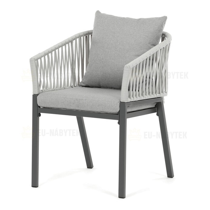 Zahradní židle s pevnou kovovou podnoží v šedém odstínu nabízí stabilitu a dlouhou životnost i při venkovním použití. Sedák a opěradlo jsou čalouněné šedou látkou, která je příjemná na dotek a vhodná pro relaxaci na zahradě či terase. Nadčasový design s jednoduchými liniemi a decentním propletením na opěradle zajišťuje univerzální využití v různých venkovních prostorách. Židle kombinuje komfort s odolností materiálů, což ji předurčuje k pravidelnému užívání v exteriéru. Díky svému provedení je snadná na údržbu a zároveň vizuálně přitažlivá.