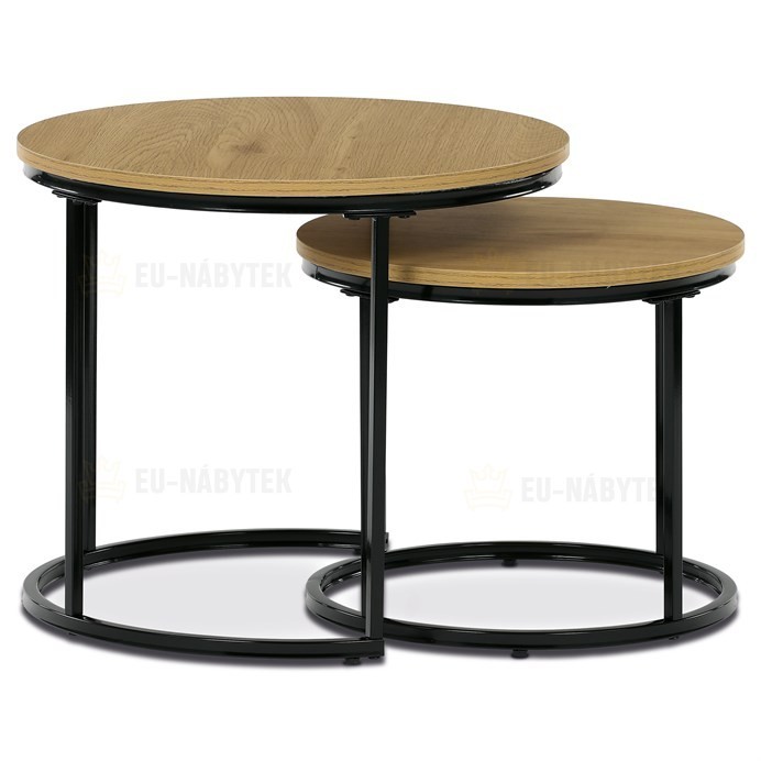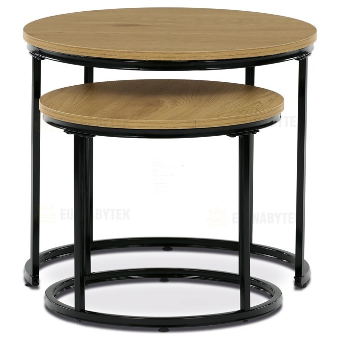Sada dvou odkládacích stolků značky Autronic spojuje moderní design a funkčnost. Kulaté desky v přírodním dekoru skvěle kontrastují s černými kovovými nohami, což vytváří elegantní industriální vzhled. Stoly lze snadno zasunout pod sebe, což šetří prostor a zvyšuje jejich praktické využití. Jsou ideální do obývacího pokoje k odložení nápojů, knih nebo dekorací. Díky pečlivému zpracování a kvalitním materiálům je tato sada stylovým a odolným doplňkem každého interiéru. Menší stolek je o průměru 43cm a výšce 37cm.