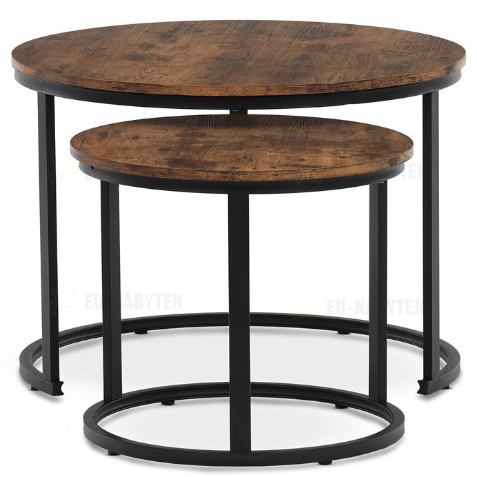 Set dvou konferenčních stolků kombinuje desky z MDF s dekorem starého dřeva a pevnou kovovou podnož v černém matném laku. Kulaté desky o hnědém odstínu s texturou připomínající přírodní dřevo vytvářejí příjemný vizuální efekt, který doplňuje minimalistická kovová podnož s kruhovým tvarem. Výška většího stolku je 50 cm, což zajišťuje pohodlné využití v obývacím prostoru. Stolky jsou navrženy tak, aby se daly snadno kombinovat a prostorově efektivně uspořádat, přičemž pevná kovová podnož zaručuje stabilitu a dlouhou životnost. Matný povrch desek se snadno udržuje a odolává běžnému opotřebení.