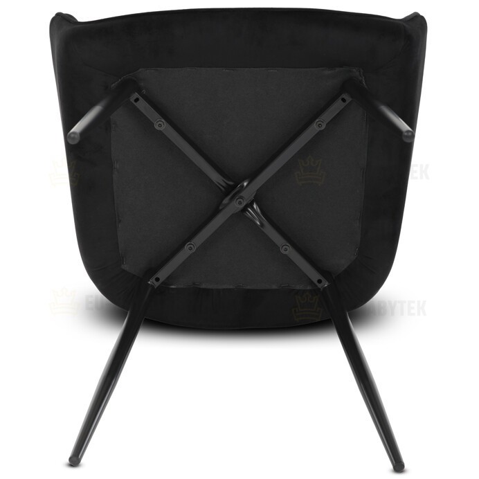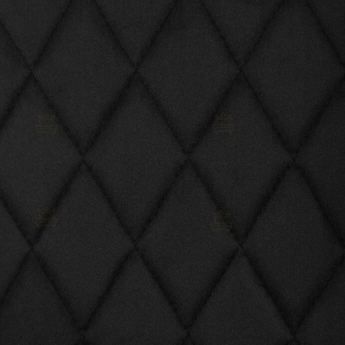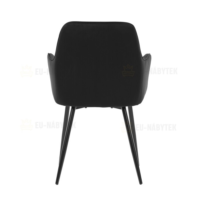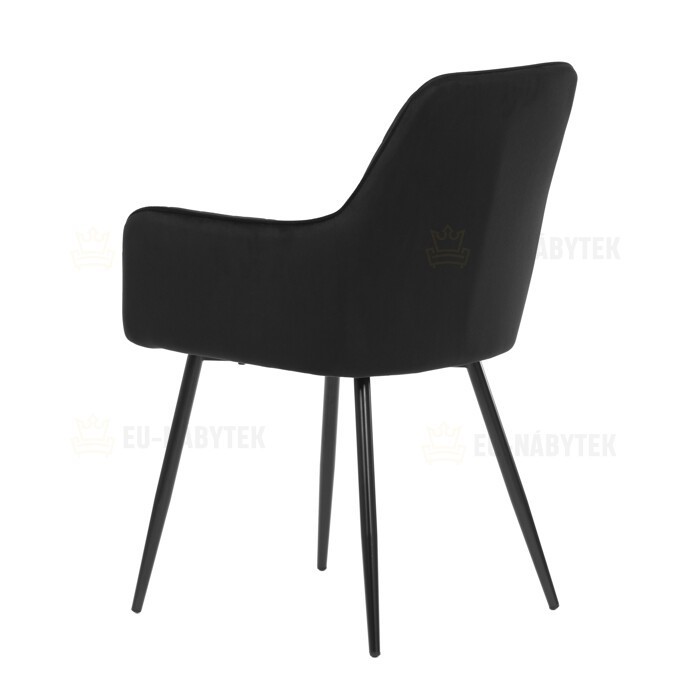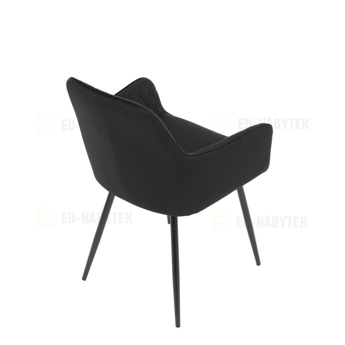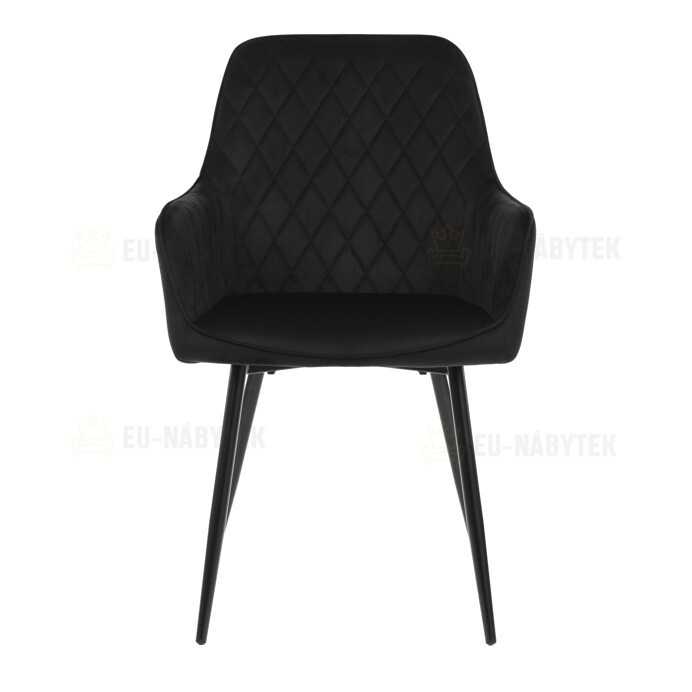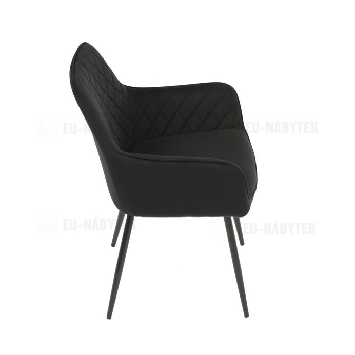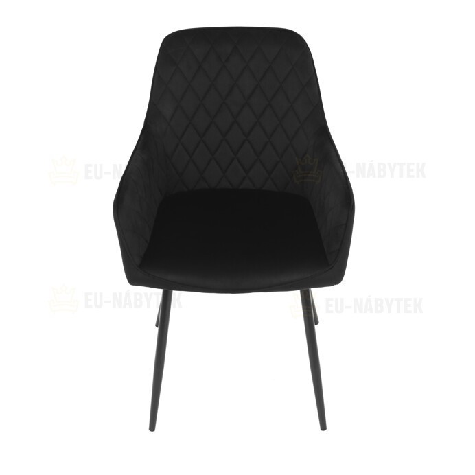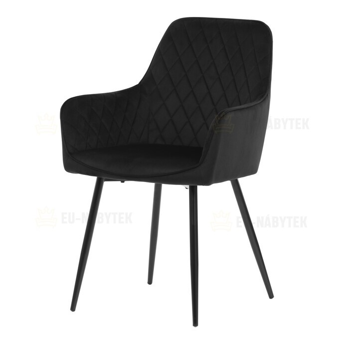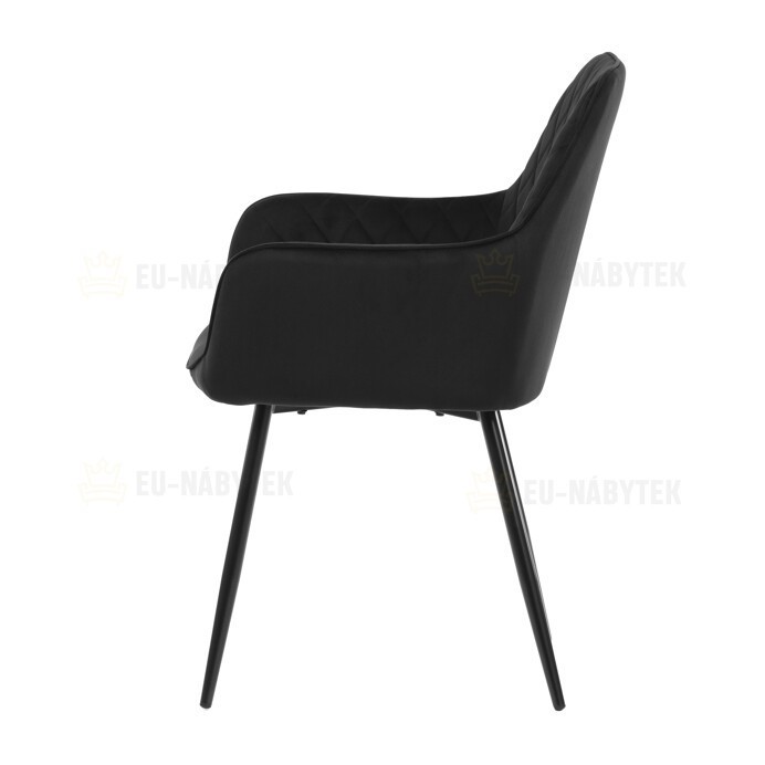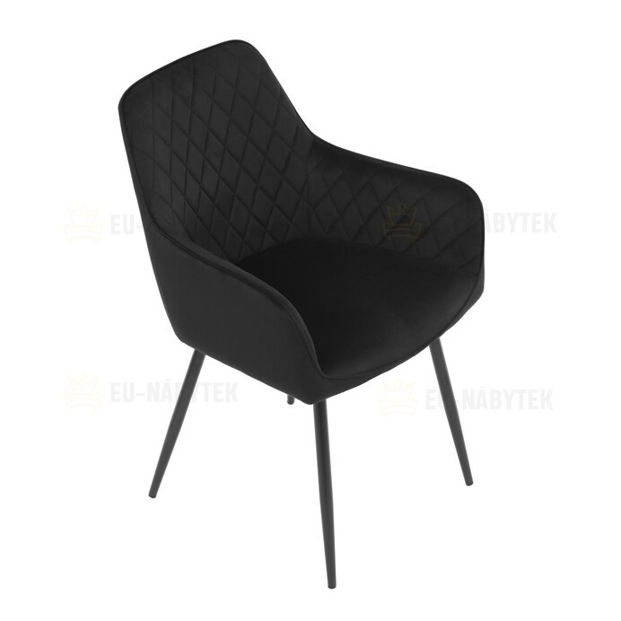 Jídelní židle s černým sametovým potahem nabízí pohodlné sezení díky měkkému čalounění a ergonomicky tvarovaným područkám. Čalounění je doplněno designovým prošitím v kosočtverečkovém vzoru, které zvýrazňuje její moderní vzhled. Pevné kovové nohy v černém matném provedení zajišťují stabilitu a dlouhou životnost židle. Sametová látka je příjemná na dotek a snadno se udržuje, což ji předurčuje k použití v jídelnách i dalších obytných prostorách. Židle není otočná, což přispívá k její jednoduché a pevné konstrukci.