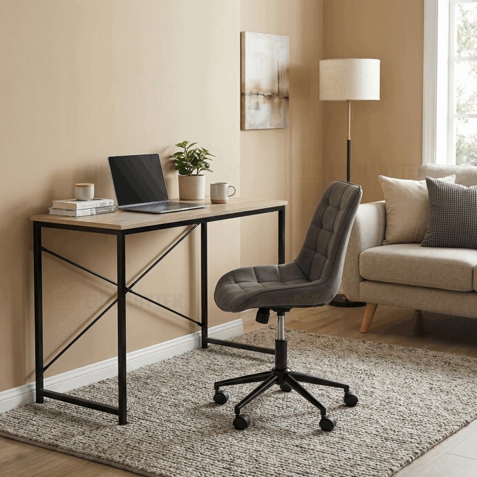 Pracovní stůl GD-504 OAK nabízí praktické řešení pro domácí i kancelářské prostředí. Deska stolu je vyrobena z MDF s dekorativním povrchem v odstínu divokého dubu, který je odolný a snadno se udržuje. Stabilní kovová podnož v černé barvě zajišťuje pevnost a dlouhou životnost celé konstrukce. Kompaktní rozměry 100x40x70 cm umožňují efektivní využití prostoru i v menších místnostech. Celková pevnost a stabilita stolu podporují pohodlnou práci s dostatečným prostorem pro notebook či psací potřeby.