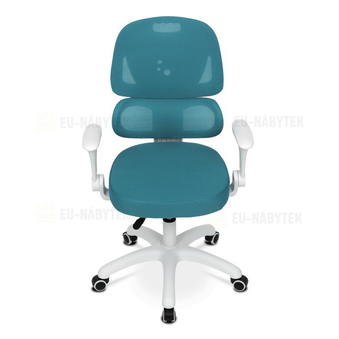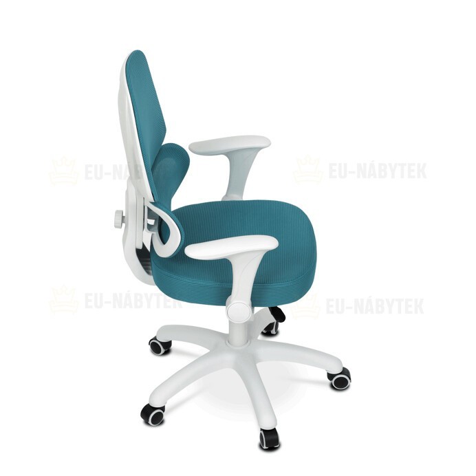 Dětská židle s modrou síťovinou nabízí pohodlné a vzdušné sezení díky prodyšnému materiálu, který podporuje cirkulaci vzduchu. Opěradlo je vybaveno výškově nastavitelnou bederní opěrkou, která zajišťuje správnou podporu spodní části zad, a výškově nastavitelným opěrákem pro individuální přizpůsobení. Odklápěcí područky umožňují snadnější přístup k pracovnímu prostoru a zároveň šetří místo. Plastový bílý kříž zajišťuje stabilitu a lehkost celé židle, zatímco kolečka jsou vhodná pro tvrdé podlahy, což usnadňuje pohyb po místnosti. Výškově nastavitelný sedák umožňuje optimální přizpůsobení výšky sezení podle potřeby dítěte.