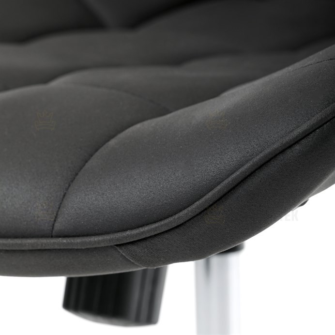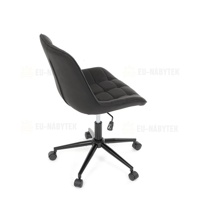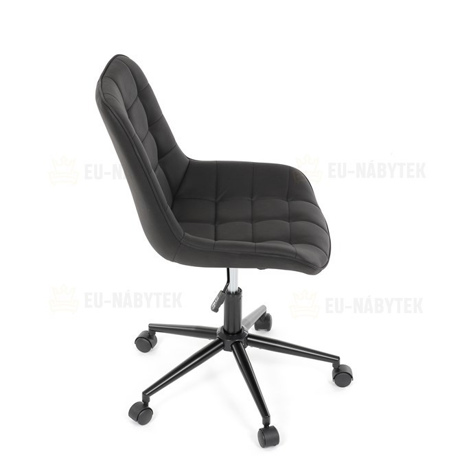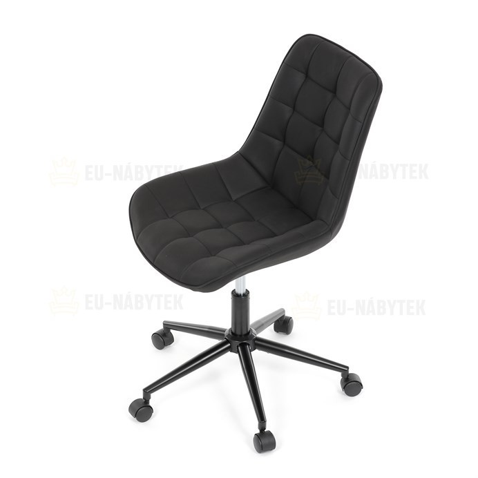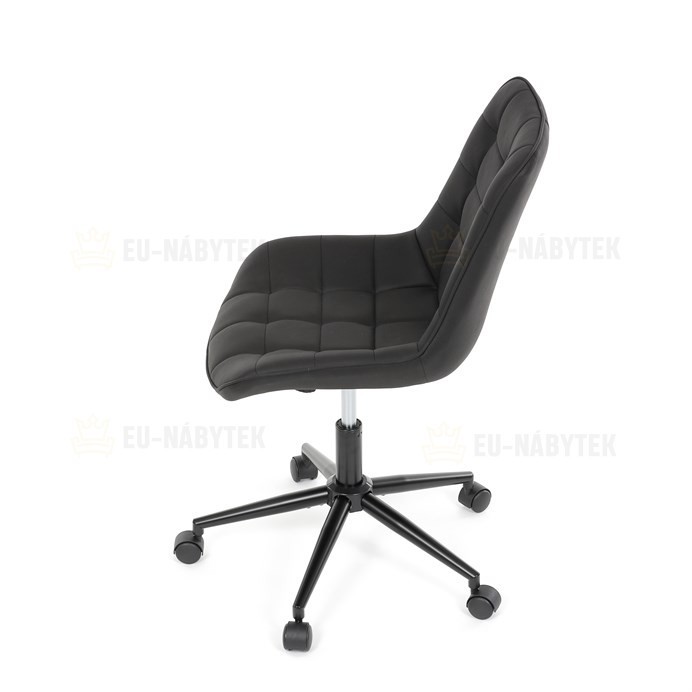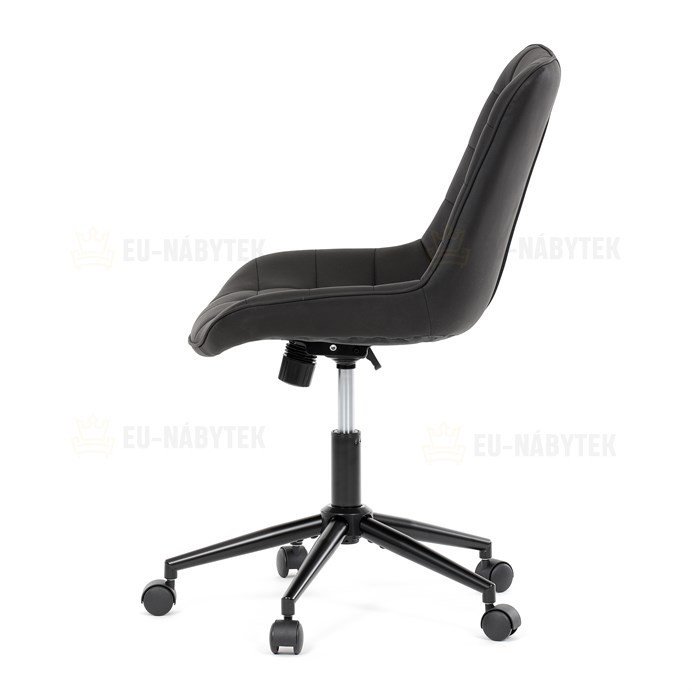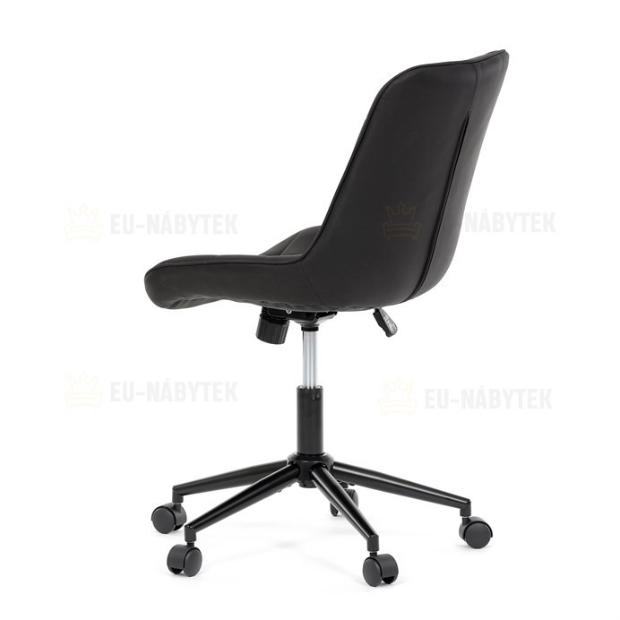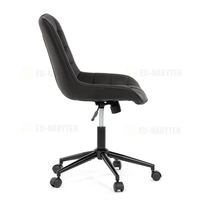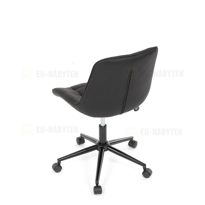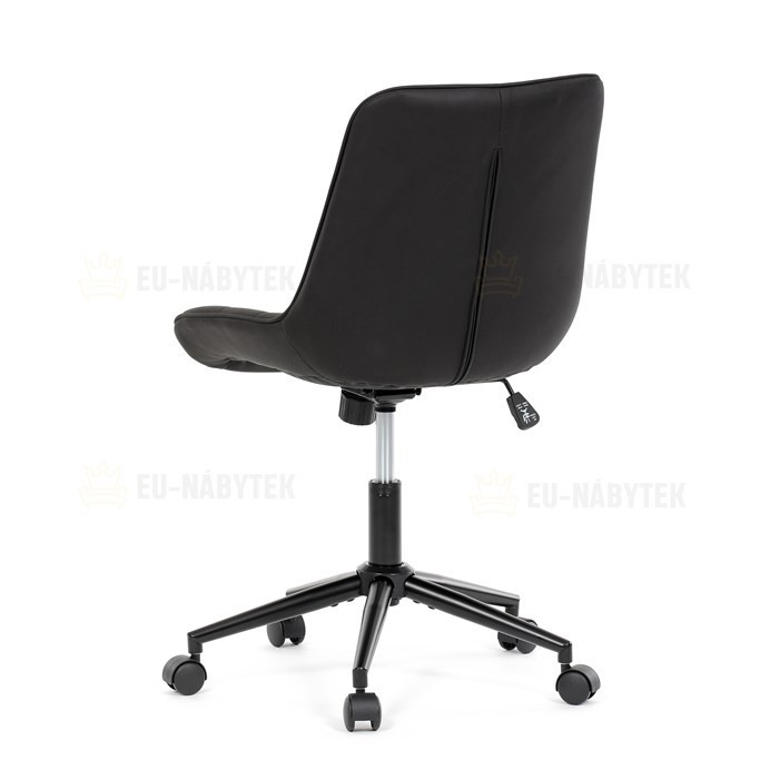 Kancelářská židle s černým potahem v dekoru broušené kůže nabízí moderní vzhled a komfortní sezení. Sedák i opěradlo jsou čalouněné kvalitní látkou, která je příjemná na dotek a snadno se udržuje. Pevný kovový kříž zajišťuje stabilitu a odolnost, zatímco houpací mechanika umožňuje plynulé naklápění pro uvolnění během práce. Výškově nastavitelná sedací plocha umožňuje přizpůsobení výšky podle individuálních potřeb uživatele. Absence područek a bederní opěrky podtrhuje minimalistický design vhodný do různých pracovních prostor.