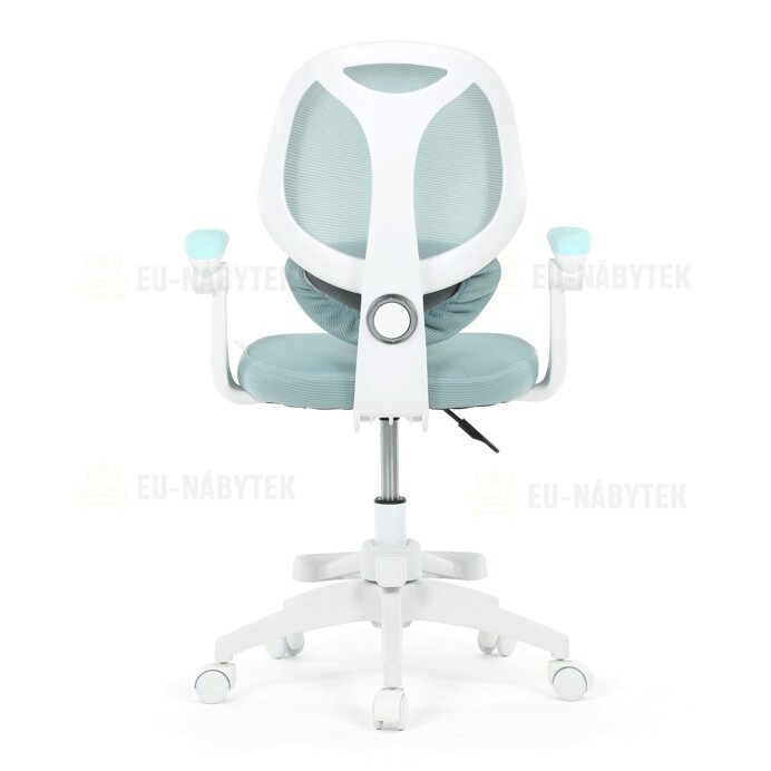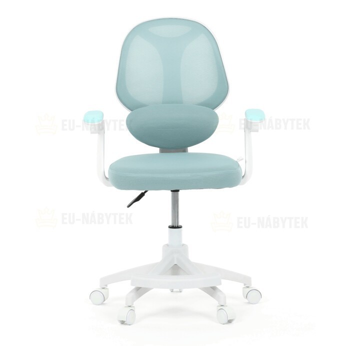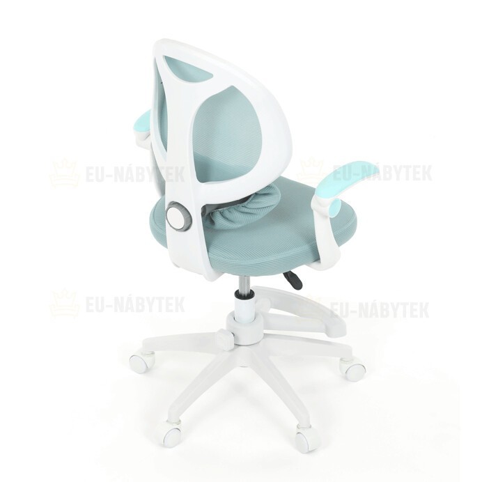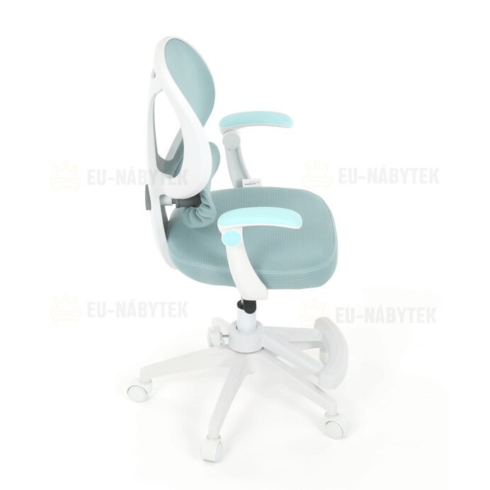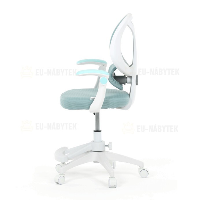 Dětská kancelářská židle s modrou síťovinou nabízí pohodlné a vzdušné sezení díky prodyšnému materiálu opěradla a sedáku. Bílé plastové nohy s pěti kolečky zajišťují stabilitu a snadnou mobilitu po různých typech podlah. Odklápěcí područky umožňují flexibilní využití prostoru, zatímco nastavitelná bederní opěrka podporuje správné držení zad během práce nebo studia. Výškově nastavitelný sedák umožňuje přizpůsobení židle aktuální výšce dítěte, což přispívá k ergonomii a komfortu. Součástí je také praktická opěrka nohou pro zvýšení pohodlí při delším sezení.